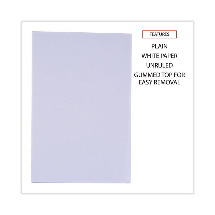 Plain, unruled, white paper pads with a gummed top and cardboard backing. The scratch pads are ideal for taking quick notes at home, the office, school, or on-the-go. Each sheet tears out cleanly and easily without leaving any residual paper tears or glue, even when torn from the center of the pad. Convenient size fits into a small bag or purse.