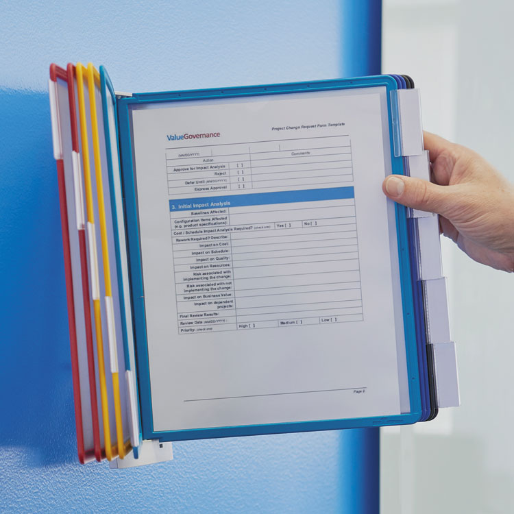 - Angled wall bracket keeps sleeves open, ensuring easy access and visibility to documents.