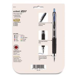 Stock your office, home or classroom with 207 Retractable Gel Pens from uni-ball with a stainless steel tip that resists bending and breaking. Even-flowing, pigment-based gel ink delivers a smooth writing experience for intense, vibrant lines, ensuring that every mark is brilliantly communicated. Use these retractable gel pens for everyday writing tasks, check signing and all of your important signatures, trusting its quick-drying uni Super Ink. Innovative uni Super Ink technology effectively entraps the gel ink into the paper, producing fraud, fade and water-resistant documents that resist check washing or bleaching. A textured grip offers greater comfort and control as you continue writing, while a translucent ink window indicates the level of gel ink remaining, so you don't run out unexpectedly. The sleek design of the 207 with modern metal accents gives the retractable gel pen a stylish touch.