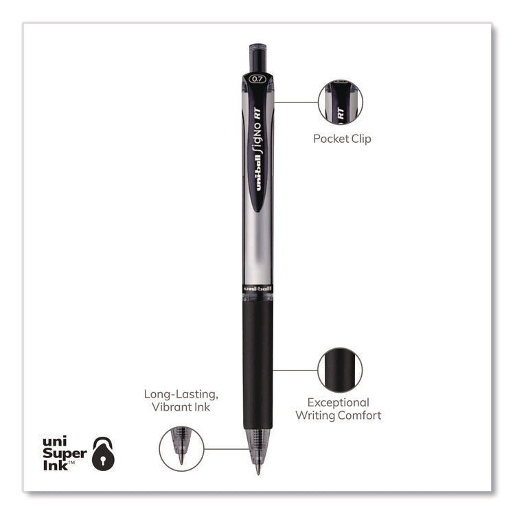 Create clear, crisp lines with Signo RT Retractable Gel Pens from uni-ball with a stainless steel tip that resists bending and breaking. Even-flowing, pigment-based gel ink delivers a smooth writing experience with long-lasting, vibrant color. Use these gel stick pens for everyday writing tasks, list making, note taking and check signing. Innovative uni Super Ink technology effectively entraps the gel ink into the paper, producing fraud, fade and water-resistant documents. A soft rubber grip helps you continue writing without fatigue while maintaining precision and detail throughout your tasks, while a translucent ink window indicates the level of gel ink remaining, so you don't run out unexpectedly.