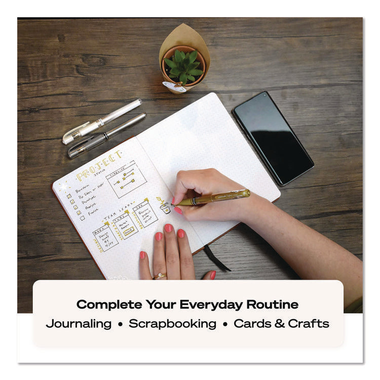 Inspire artistic interest as you easily embellish your writing and drawing. The shimmery shades of Signo Gel Impact Metallic Color Pens help your work stand out. Featuring a bold, thick and silky ink flow, Signo Gel Impact have a vibrancy that places them among the best pens for adding a pop of metallic flair. Their smooth-glide point and comfortable grip help you maintain precise control as you create, while making it easier to work longer whenever inspiration strikes. A quick-drying, acid-free ink formula and uni Super Ink technology ensure your marks are deeply entrenched into the paper for water- and fade-resistant, archival-safe results, making these pens ideal for decorating scrapbooks, journals, greeting cards... anything you want to last. If you're feeling adventurous, try them out for adding an artful twist to letters and envelopes or for elevating your important notes and bullet points to the next level. No matter how you choose to use them, Signo Gel Impact Metallic Color Pens deliver the right balance of vibrancy, performance and precision to meet your needs in any creative endeavor.
