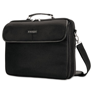 Versatile laptop computer case securely holds laptops with screens up to 15.6". Exterior storage compartment with flap allows easy access to documents and other materials. Organizational compartments protect accessories. Easy to attach to roller bags.