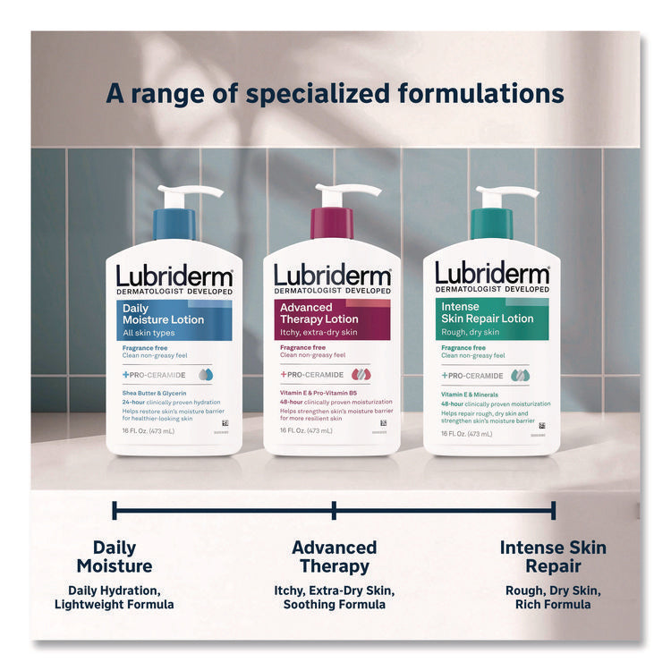 Ideal for normal-to-dry skin types, Lubriderm Daily Moisture Fragrance-Free Body Lotion is an ideal solution to replenish and moisturize dry skin that's suitable for the whole family. From a dermatologist developed brand, this daily moisturizing lotion is clinically proven to moisturize dry skin for 24 hours and helps achieve healthy-looking skin. It is formulated with Pro-Vitamin B5 and skin essential moisturizers to help improve your skin's moisture barrier. This lotion has a non-greasy, unscented formula for a pleasant, soft, and smooth feel to the skin. The fast-absorbing formula of this fragrance-free body lotion is great for tattoo care and helps keep tattooed skin looking its best. Plus, Lubriderm is the #1 recommended brand by tattoo artists for tattoo care and aftercare.