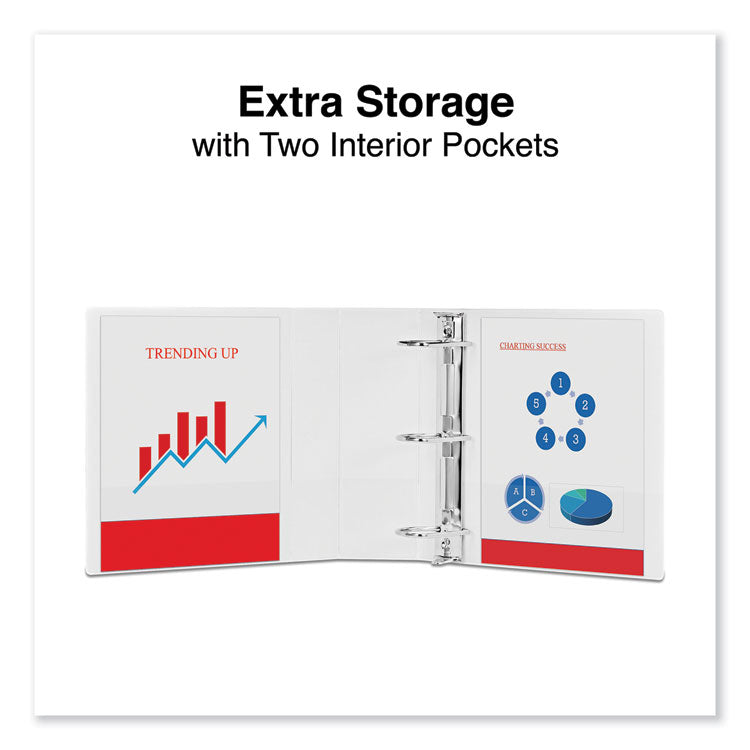 Neatly store and access your filing documents with standard view binders. Slanted D-rings allow smooth page turning and hold more documents than the same-size, round rings. Open and close triggers provide fast, nearly effortless access to single sheets. The oversized, transparent, panels provide endless customization options. The view binders cover tabbed dividers, sheet protectors, and other organization accessories. Interior includes two pockets for convenient access to single pages and reference materials. Constructed with nonstick, archival-safe material that's designed to prevent ink from being lifted off printed pages.