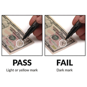 Highly effective and inexpensive tool for detecting bad bills. Simply make a small mark on U.S. currency. Chemically sensitive ink works instantly. An amber mark passes the test, while a dark brown or black mark fails, meaning the bill is likely counterfeit. Works on all new design U.S. currency (bills series 1959 and later).