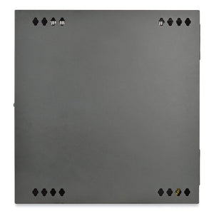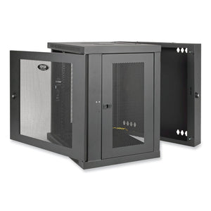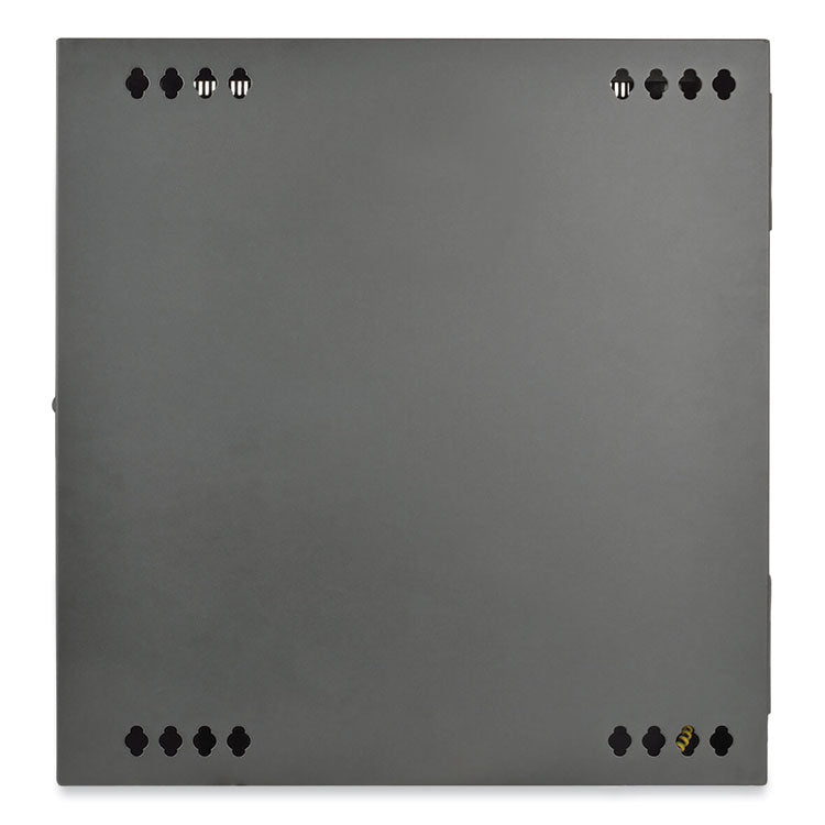 Designed to house EIA-standard 19-inch rack equipment in network wiring closets, retail locations, classrooms, back offices and other areas with limited floor space where you need equipment to be secure, organized and out of the way. Constructed from heavy-duty steel with a durable black powder-coated finish, the cabinet has a maximum load capacity of 200 pounds. The side panels and front door lock securely to help prevent damage, tampering or theft. The front, top, bottom and removable side panels are vented, which allows air to flow freely and keep equipment cool. The reversible front door can open left or right by rotating the cabinet 180° before mounting. Convenient top and bottom ports allow easy cable routing. Comes fully assembled and ready to mount to the wall.