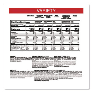 - Variety pack of potato crisps in six flavors: Original, Cheddar Cheese, Sour Cream and Onion, BBQ, Pizza, and Cheddar and Sour Cream.