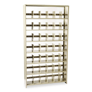 Save 50% of the floor space used by conventional files. For highly active files and records. Provides a single freestanding unit or use with Add-On Units for a complete wall system. Units snap together without tools or fasteners. All shelves are adjustable. Order one Starter Set and any number of matching height Add-On Units. Two "L" uprights for the frame. Includes adjustable 12" deep shelves, shelf supports and five file dividers per shelf. 200- to 300-lb. load capacity per shelf with weight evenly distributed. Heavy-duty rolled steel construction with sand finish.