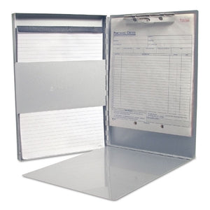 Side-opening form holder with 3/8" storage compartment features an inside clip that allows easy access to forms. High-tension serrated clip securely holds a stack of paper up to 1/2" thick. Hinged writing plate conceals documents and prevents write-through on multi-part forms. Storage compartment holds more than 30 forms with a hinged strap inside the cover. Form holder is made of aluminum with a high percentage of recycled material.