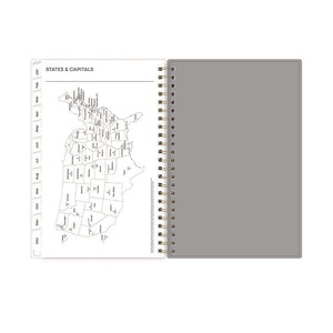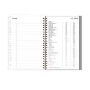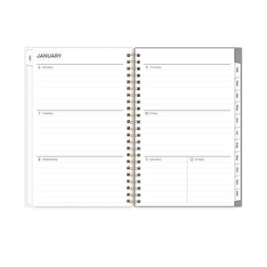 - Weekly view per two-page spread contains lined writing space with ample space for planning.