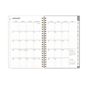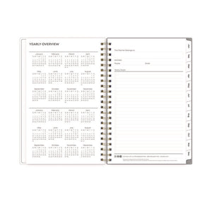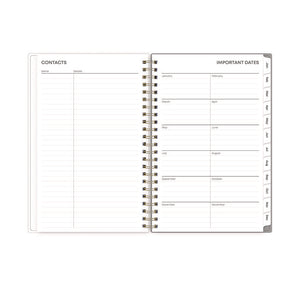 Give your schedule a fresh start and bring order to your busy life with the lovely Sophie Planner and its bright floral motif on a neutral gray background. Two-page-per-week spread features lined daily blocks with ample space for planning. Monthly view per two-page spread includes a Notes section for important projects. Monthly tabs are coated for durability. Durable, frosted flexible front cover. Twin-wire binding offers easy page turning. Includes pages for Yearly Goals, Contacts, Reference Calendars, and extra Notes pages. Thick, premium quality pages reduce ink bleed-through. Includes six bonus past monthly views for easy yearly transition.