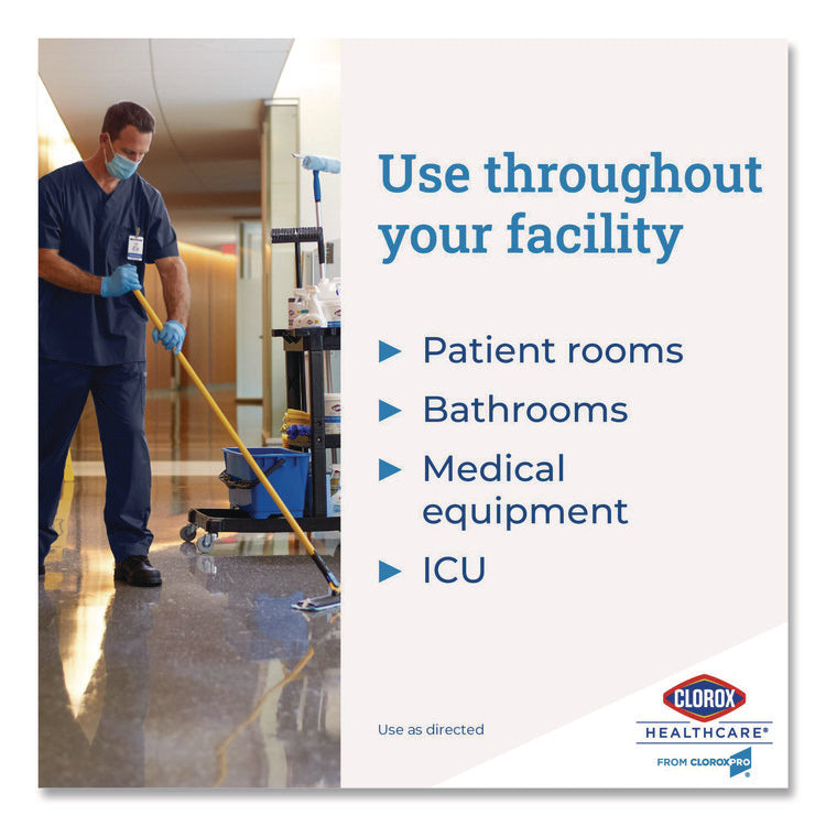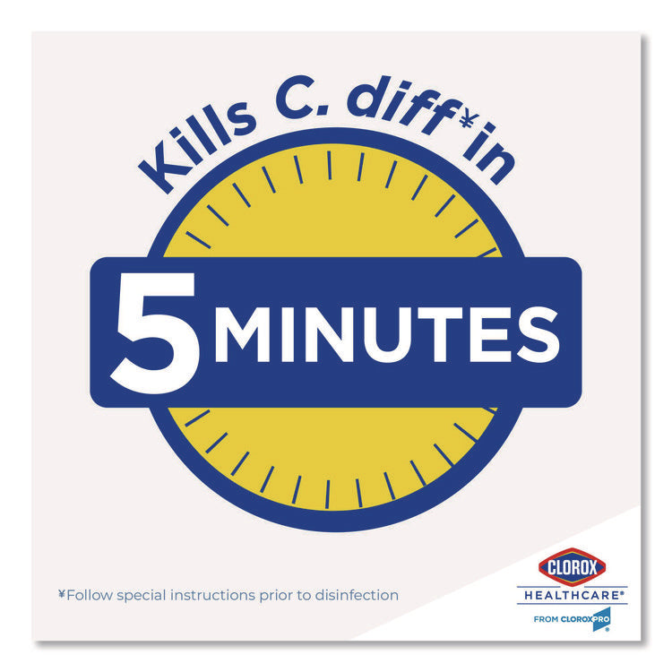 Clorox Healthcare Spore Defense is your low odor, easy-on-surfaces cleaner disinfectant for facility-wide use. This open-system cleaner disinfectant kills 56 microorganisms including C. difficile spores in five minutes and acts as a Bactericidal, Virucidal and Fungicidal in three minutes or less. It is also EPA registered to kill Candida auris, considered an urgent antibiotic resistant pathogen threat by the CDC. This Spore Defense cleaner meets EPA criteria for use against SARS-CoV-2, the virus that causes COVID-19 on hard, nonporous surfaces when used as directed. Compatible with a wide variety of surfaces including acrylic, chrome, aluminum, plastic, vinyl, glazed porcelain, PVC, plastic and stainless steel, this spore cleaner is suited for use on floors, bed frames, infant incubators, showers, stretchers, wheelchairs and more. Ideal for use in clinics, doctor offices, emergency rooms, hospitals, patient rooms and more.