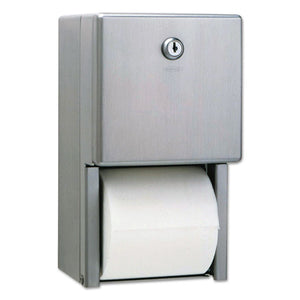 Holds two standard rolls up to 5 1/4". Extra roll automatically drops into place when bottom roll is depleted. Reduces maintenance time and need for replacement. Door has tumbler lock. Spindles are heavy-duty and theft-resistant. Satin finish.