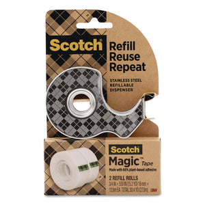 Grasp empty tape core and remove. Replace with a new tape roll. Refill. Reuse. Repeat: reuse the handheld stainless steel office tape dispenser for life, refill with any Scotch Brand Tape and repeat with the included refill roll. Metal blade cuts tape effortlessly, use caution with the sharp blade. For any home looking to use more plant-based materials, turn to Scotch Tape for your favorite tape projects, like labeling, light hanging, repairing, decorating and more. Made with 66% plant-based adhesive, this tape has the same great performance you know and expect from the original Scotch Magic Tape. This plant-based adhesive tape has the strength and holding power and disappears just like the original, tried-and-true Magic Tape. With a matte finish, this tape provides a clean finish that blends nicely on a variety of surfaces. It is perfect for fixing torn or ripped documents such as birth or wedding certificates and is great for school projects, because you can write on it with a pen, pencil, or marker. The starter pack includes one refillable and reusable handheld Scotch Stainless Steel Tape Dispenser and two rolls of 0.75 in x 550 in Scotch Magic Tape made with 66% plant-based adhesive.