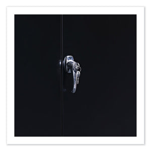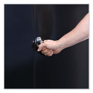 Standard assembled storage cabinet with three-point locking bar system locks top, bottom, and doors. Durable, reinforced doors with satin chrome double handles open 180° for easy access to contents. Industrial-grade steel with powder coat finish for long lasting use. The sturdy, 16-gauge door frame prevents racking. Heavy duty secure knuckle hinges for longevity. Built-in leveling glides help compensate for uneven floors.
