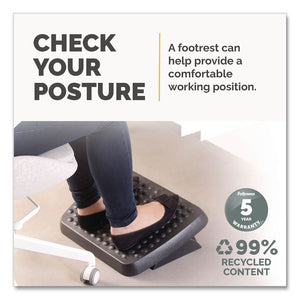 Fellowes® Standard Footrest offers dual-position height adjustment with a Free-Floating platform that encourages lower leg movement to help reduce fatigue. A textured surface massages the soles of your feet for stress reduction. For use in the office or home office, bringing comfort with you everywhere. Product contains post-consumer recycled materials. Look for other coordinating ergonomic products by Fellowes to make your workspace more comfortable.