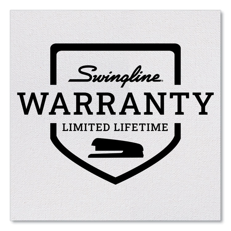 Designed with a modernized rounded look and feel, this reliable Swingline stapler is easy to use. Perfect for regular stapling at work, home or school. This classically designed stapler has a plastic cap that is made from recycled material. Stapler opens for tacking ability and has a rotating anvil to be able to create a temporary pin staple. Full rubber base prevents skidding during desktop use.