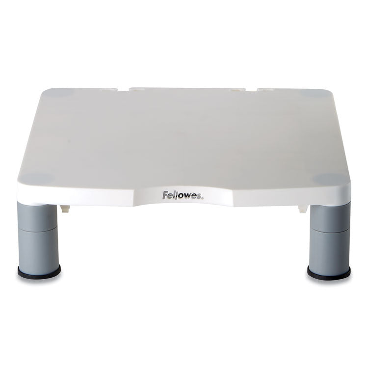 Fellowes Standard Monitor Riser features innovative stacking columns that raise monitor to comfortable viewing height. Supports 21" monitor or a maximum weight of 60 lb. Features three different height adjustments from 2" to 4". Space-saving design with high-impact plastic construction. Includes convenient cord management and non-skid rubber feet. Perfect for the office or home office, school, or wherever you'd like to organize your workspace.