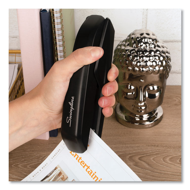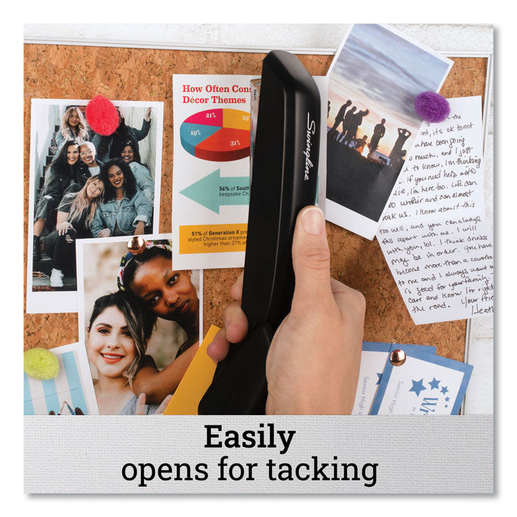 Reliable stapler is ideal for occasional stapling, tacking and pinning tasks. Featuring a classic design, the Swingline® Standard Stapler is both very comfortable and easy to use. Stapler opens fully for instant tacking ability and features a reversible anvil to create temporary pin staples - pin staples are easily removed without a staple remover. Value Pack comes complete with 5,000 standard staples and a staple remover, everything you need to get started.