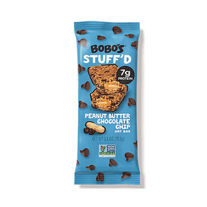 Bobo's Stuff'd oat bar starts with wholesome whole grain oats mixed with a delicious Peanut Butter and Chocolate Chip flavor. The bar is gluten-free, certified non-GMO, vegan and dairy-free. All without boring the daylights out of your taste buds. The bar is packed full of whole grain oats and tons of flavor to keep your body going and your taste buds begging for more.