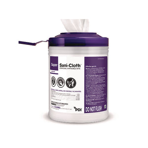 Super Sani-Cloth germicidal disposable wipes are proven effective against enveloped and non-enveloped viruses, fungi, bacteria, multidrug-resistant bacteria and blood-borne pathogens—32 microorganisms in all, including SARS-CoV-2. A fast contact time of just two minutes accommodates quick room turnovers, making them ideal for daily use in fast-paced environments that require short contact times and broad microorganism coverage. Thick and strong with a high fluid capacity, each wipe is also pliable enough to get into tight crevices and corners. Safe for use on a broad range of health-care equipment and most hard, nonporous surfaces. Active ingredient: isopropyl alcohol 55.5%.