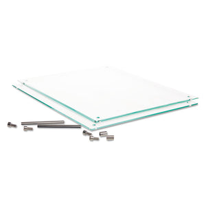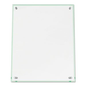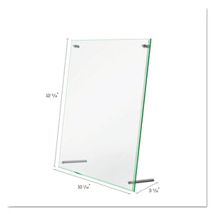 Sleek, beveled-edge sign holder highlights and protects your message. Sophisticated acrylic construction with green-tinted edges and silver post base provides the elegant look of glass. Repositionable posts allow your message to be displayed horizontally or vertically. Designed to securely float signage between the two lightweight, durable, clear panels. Unscrew posts to easily change literature and orientation. Set the freestanding, slanted, sign holder on your counter for a quick, high-end display.