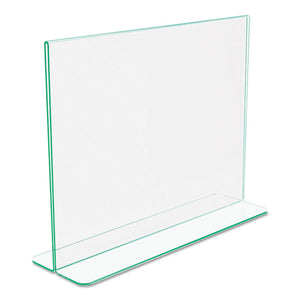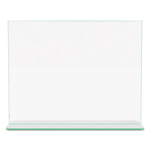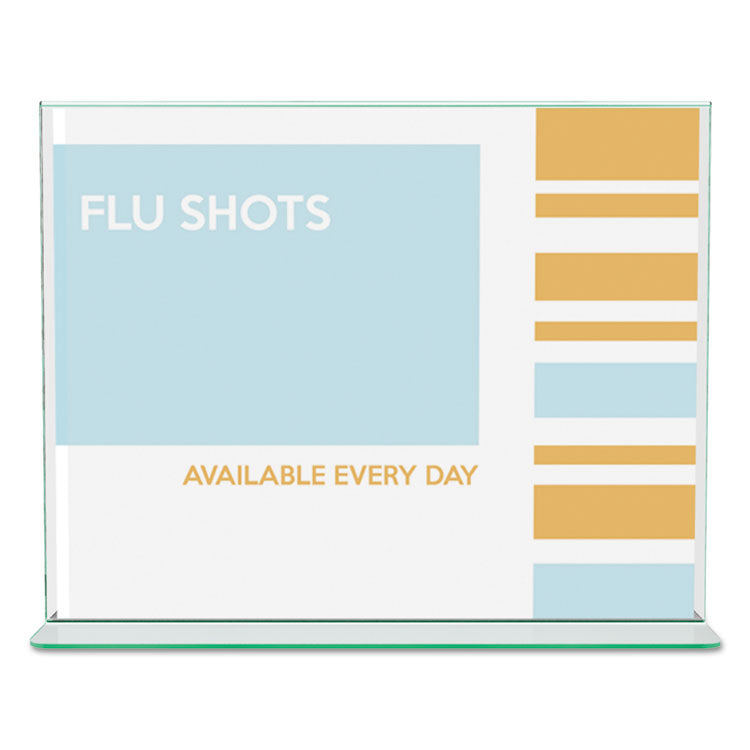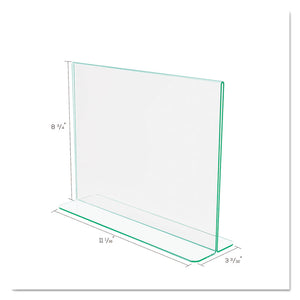 Display your message in style with this premium green-edge sign holder. Sleek design provides a glass-like appearance with smooth, rounded, green-tinted edges that enhance your insert. Lightweight and durable with easy side- and bottom-loading capabilities to quickly change out your sign. Great for displaying high-end signage, awards or certificates. Clear viewing panels from both sides offer full visibility and protects inserts from damage. Accommodates 8.5" x 11" inserts.