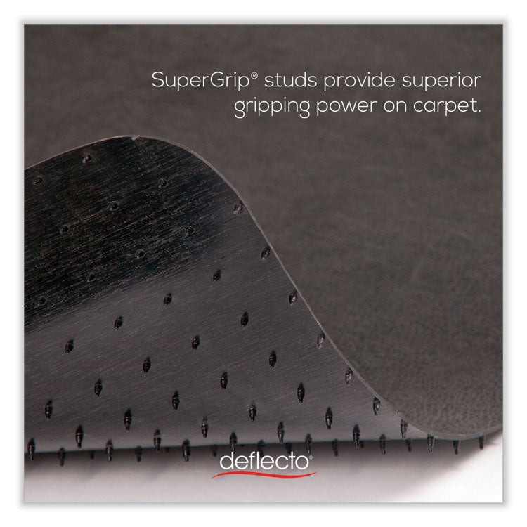 The SuperMat® chair mat is a versatile choice for frequent use on carpets up to 1/2" thick and is well-suited for a variety of commercial and home office applications. Easy-glide rolling surface provides smooth chair movement to help minimize stress and strain on users back, legs and feet. Bottom studs grip the carpet securely and keeps the chair mat from moving. Deflecto's Free and Clear® non-orthophthalate, non-cadmium formula promotes a healthy work environment.
