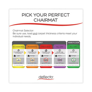 The SuperMat® chair mat is a versatile choice for frequent use on carpets up to 1/2" thick and is well-suited for a variety of commercial and home office applications. Easy-glide rolling surface provides smooth chair movement to help minimize stress and strain on users back, legs and feet. Bottom studs grip the carpet securely and keeps the chair mat from moving. Deflecto's Free and Clear® non-orthophthalate, non-cadmium formula promotes a healthy work environment.