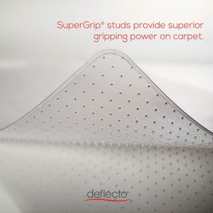 The SuperMat® chair mat is a versatile choice for frequent use on carpets up to 1/2" thick and is well-suited for a variety of commercial and home office applications. Easy-glide rolling surface provides smooth chair movement to help minimize stress and strain on users back, legs and feet. Bottom studs grip the carpet securely and keeps the chair mat from moving. Deflecto's Free and Clear® non-orthophthalate, non-cadmium formula promotes a healthy work environment.