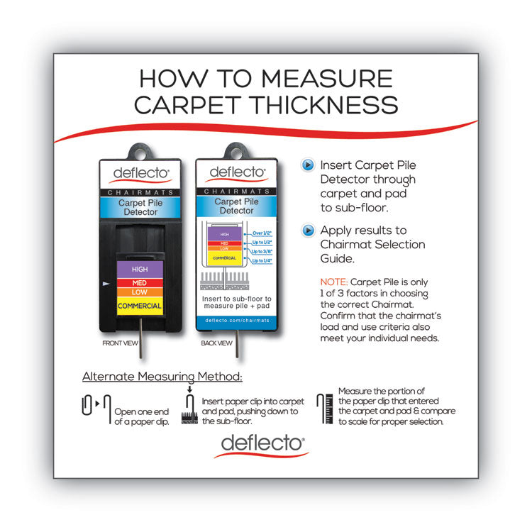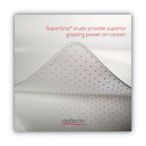 The SuperMat® chair mat is a versatile choice for frequent use on carpets up to 1/2" thick and is well-suited for a variety of commercial and home office applications. Easy-glide rolling surface provides smooth chair movement to help minimize stress and strain on users back, legs and feet. Bottom studs grip the carpet securely and keeps the chair mat from moving. Deflecto's Free and Clear® non-orthophthalate, non-cadmium formula promotes a healthy work environment.