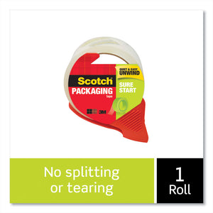 Scotch® Sure Start Packaging Tape features technology that allows a smooth, easy unwind. Seal your boxes with less noise when in a crowded office or a quiet cubicle setting. Sure Start means the tape unwinds smoothly, from start to finish, with no slivering or splitting for frustration-free taping. The tape's strong adhesive will keep even your heavy boxes sealed. For added utility, you can apply the crystal clear tape over shipping labels for greater shipping security.