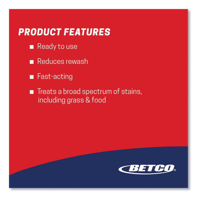 Ready-to-use broad spectrum prewash spotter is effective on food soil, ink, grass, and cuff and collar stains. Formulated with naturally occurring solvents, PRO A works quickly to ensure one wash cleaning. When used as directed and in accordance with Betco's Best Laundry Practices wall chart, Pro A will save time, energy, and labor costs. This product reduces chemical consumption and produces clean results in one wash. PRO A is part of Betco's LaundryPro Stain Treatment Center.