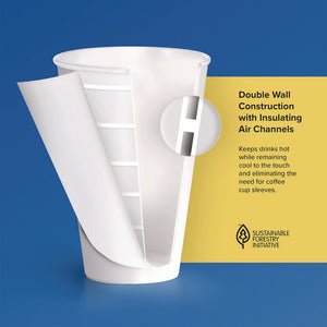 The moisture-blocking poly lining protects against leaky seams and soak-through. Save money by reducing the need for sleeves or double cupping. The double-wall construction combined with insulating air channels keeps the heat inside and the cup cool to the touch. Coffee, tea and hot chocolate maintain warmth while on the go! Whether you're in the foodservice industry, managing an office or planning an event, we have a beverage serving solution you can count on. Compatible lids are sold separately. Four cup sizes share one lid.