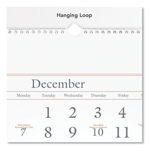 Vertical format calendar fits easily in compact spaces. Quality buff paper. Three months per page: past, current and future months. Large, easy-to-read numbers. Federal holidays highlighted. Chipboard backing; white wirebound with hanging loop. Printed on high-quality paper with superior ink bleed resistance.