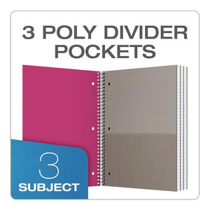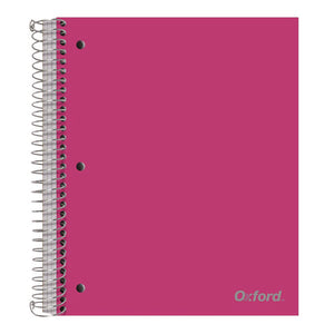 This Oxford three-subject poly notebook comes in bright colors and is three-hole punched to fit a standard binder. Includes three poly divider pockets and a strong no-snag coil. Comes in assorted colors.