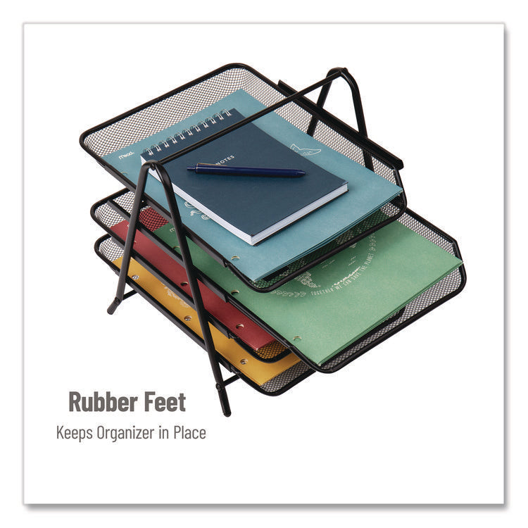 Multi-tiered design provides ample storage capacity for storing and organizing a variety of items such as files, mail, documents, folders, bills and letters. Declutter your desk or counter and keep everything within easy reach. The attached rubber feet ensure that the organizer stays in place. Access your items with confidence, knowing that the organizer won't slip or move around on your desk. The rubber feet also help protect your desk surface from scratches. With a convenient carrying handle, this tray organizer is easily portable. You can take it with you wherever you work, whether it's in a college dorm, office, home, school, conference room, business, hotel or any other setting. This versatile organizer streamlines your space and keeps papers in place, making it an ideal solution for improving organization and efficiency. Accommodates standard-sized documents and provides ample storage space while remaining compact.