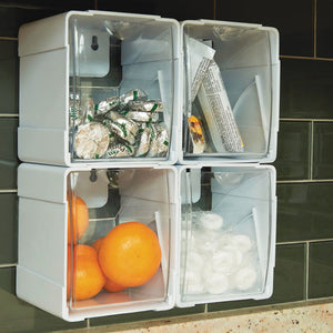 The ultimate in versatility. Create the ideal storage solution for the space you have available. Interlocking dovetail design stacks and connects vertically and horizontally. Add on as many as you need. Clear bins provide visibility and tilt out for easy cleaning and refilling. Can be used on counter top, mounted to wall directly, hung on mounting bar (sold separately), or underneath cabinets.