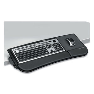 Features strong brackets that easily attach to desktop edge up to 1.75" thick without tools or surface damage, allowing platform to effortlessly tilt and slide. Extended knee clearance keeps you comfortable while typing and mousing. Single lever easily adjusts tilt (flat to 30°) and slide (4.63" travel distance). Unique textured surface keeps mouse from sliding off mousing platform. Ultra soft memory foam wrist support with Microban antimicrobial product protection keeps product cleaner.