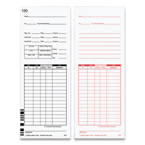 Record daily details precisely with these time cards designed for use with Lathem 7000E and 7500E time clocks. Made with heavy-duty stock, these cards are perfect for industrial, food service, or general office applications. Featuring black print on the front side and red on the back to ensure correct use, these Lathem time cards are numbered and bar coded to make record-keeping easy. Spots for recording time are easy to read as the time clock imprints text in precise areas. Columns show exactly when an employee clocked in and out during the pay period, while places for a name, signature and pay amount are clearly marked outside of the stamped areas. These time cards work for weekly, biweekly and semimonthly time periods.
