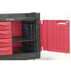 TradeMaster Cart with One Door, Plastic, 3 Shelves, 4 Drawers, 750 lb Capacity, 26.25" x 49" x 38", Black