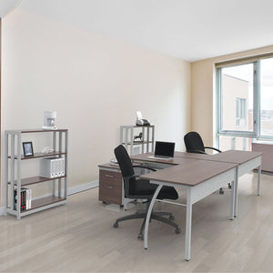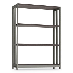 Stylish minimalist design for universal appeal. Scratch- and stain-resistant woodgrain laminate with durable edge. Adjustable leveling glides for stability. Quick and easy assembly in minutes. Strong powder coated steel frame with laminate shelves. Four shelves.