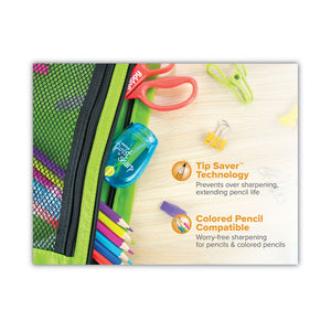 A fun and stylish design with an innovative ratchet mechanism for fast and easy sharpening -- perfect for school, work or home. Sturdy, compact, handheld sharpener safely and conveniently travels in any school bag or pencil case. Adjustment knob makes it easy to choose a sharp or a blunt tip based on your preferences. Tip Saver technology prevents over-sharpening, extending the pencil's life. Internal shavings receptacle captures loose pencil shavings to eliminate messes. Flip-down side door allows for quick shavings disposal. Color-pencil compatible.