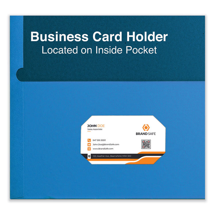The perfect presentation piece, a sturdy, two-pocket, textured folder for holding documents, brochures, sales flyers, and proposals. The portfolio texture adds a nice touch to an economical portfolio. Constructed with built-in, die-cuts on left pocket to keep your business card in view for follow-up. Great as a leave-behind folder for literature or proposal. Holds 8.5" x 11" paper sheets and a 3.5" x 2" business card.