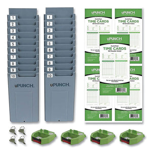 Process time and attendance data online and generate informative reports with this electronic time clock bundle. The included time cards let you track months' worth of attendance in large workplaces, while the two time card racks help keep cards organized. The compact time clock is easy to mount on walls or tables and has an auto-aligning card slot that makes it easy for employees to punch cards precisely. An integrated print mechanism marks cards clearly and highlights late or early punches in red, ideal for keeping track of attendance and hours worked. Use the included uPunch™ cloud software to enter, manage, and run reports on time card data from any Internet-enabled device.