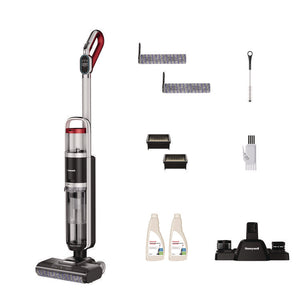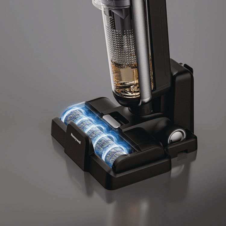 The Honeywell professional 3-in-1 Cordless Floor Cleaner is engineered to vacuum and wash hard floors simultaneously, and perfect for quick carpet clean-ups (without water). This high-performance device is equipped with a high-tech synchronized digital wet and dry motor for powerful suction and features a motorized multi-surface power scrub soft roller for an in-depth clean. Our innovative patent-pending design separates wet and dry waste, complemented by the stainless-steel precision spray nozzle and large, separate clean and dirty water tanks that ensure high-efficiency cleaning. Commercial-grade metal side support tubes add an extra layer of durability. The easy-to-use LED display and intelligent voice prompts, along with the advanced Smart Auto Clean Mode, optimize your cleaning experience. With an easy-change, high-capacity battery pack providing up to 35 minutes of runtime, and an easy-charge base with accessory storage, maintaining your device is virtually effortless. The package includes two power scrub rollers, two wet/dry filters, and two bottles of multi-surface floor cleaner for the ultimate cleaning solution.