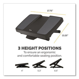 The Fellowes® Ultimate Foot Support features a free-floating platform that encourages lower leg movement to help reduce fatigue. Three platform height settings (4", 5.25" and 6.5") and up to 25° tilt. Surface massage bumps help relieve work-related stress. Elevates feet and legs to help relieve lower back pressure and improve posture. Work in comfort. Perfect for use in the office, home office, or wherever you sit for long periods of time.