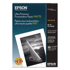 For photographers seeking a flat matte surface, Ultra Premium Presentation Paper Matte is the ideal choice. This bright white paper is perfect for images that do not require gloss. It yields highly saturated images, while maintaining excellent highlight and shadow detail. Designed primarily for use with UltraChrome™ Inks, EPSON Archival™ Inks, and DuraBrite™ Inks, this versatile paper can also be used with dye-based inks. Hobbyists, professional photographers and digital artists alike will find Epson Ultra Premium Presentation Paper Matte a remarkable solution for any project.