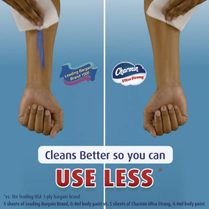Get sparkly clean with Charmin Ultra Strong. It's 4X stronger when wet and has a diamond weave texture. It's woven like a washcloth and it holds up when you wipe. It even cleans better so you can use less and go longer without changing the roll. Larger rolls mean more bang for your behind so you'll be running back to the store less and less (based on number of sheets in Charmin Regular Roll bath tissue). Our Charmin Ultra Strong toilet paper is also 2-Ply and is designed to be clog-safe and septic-safe so you can flush confidentially and keep clean. We all go, why not Enjoy the Go with America's favorite toilet paper.