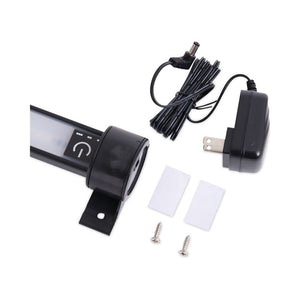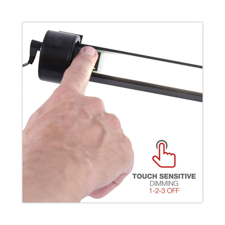 Add light to any worksurface with these handy undermount LED lights. Mounts under hutches, cabinets, or on walls. Modern touch-sensitive dimming—1-2-3-off. Rotating frame swivels 360° for fast quick re-direction of the light. 8-watt surface-mount LEDs have an average rated life of 20,000 hours. Mounting hardware kit includes screws, anchors and double sided tape. Attractive black matte finish. Includes AC adapter/LED driver with 70" long cord.